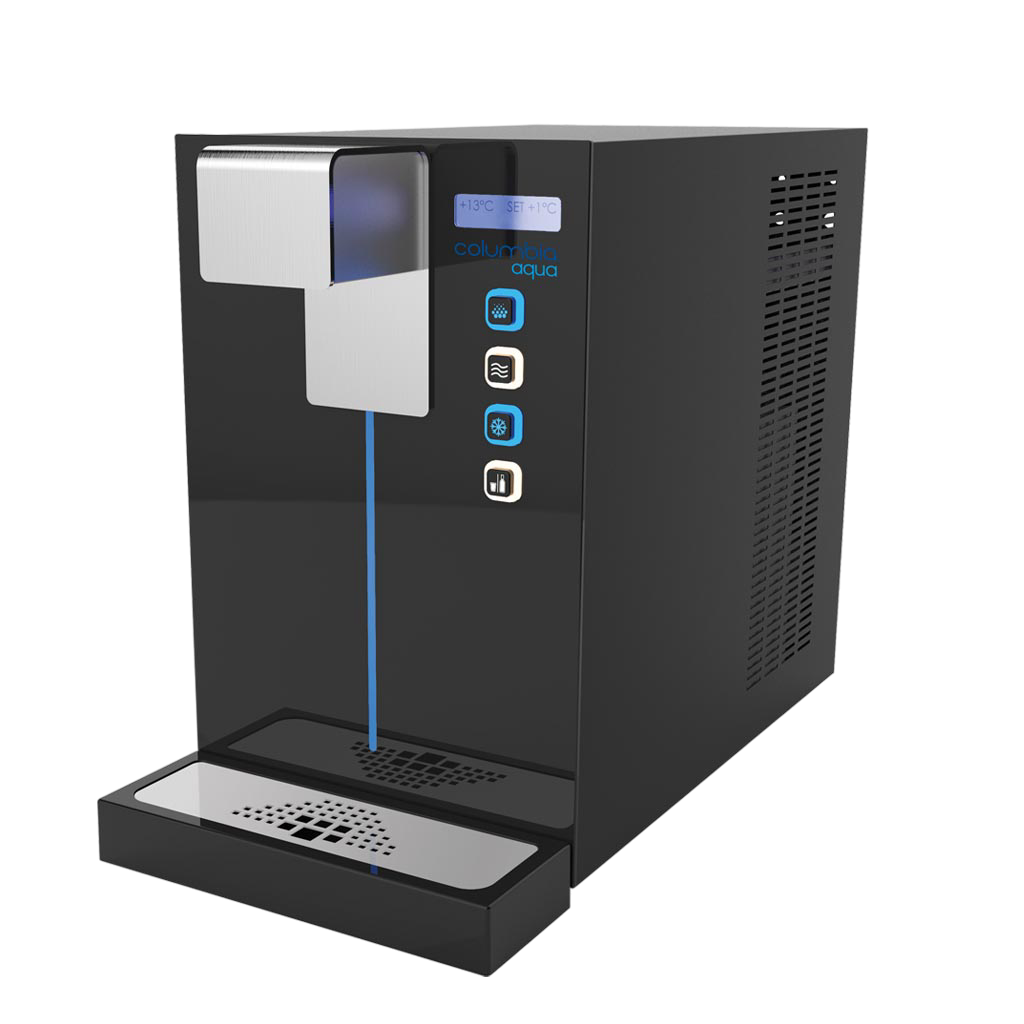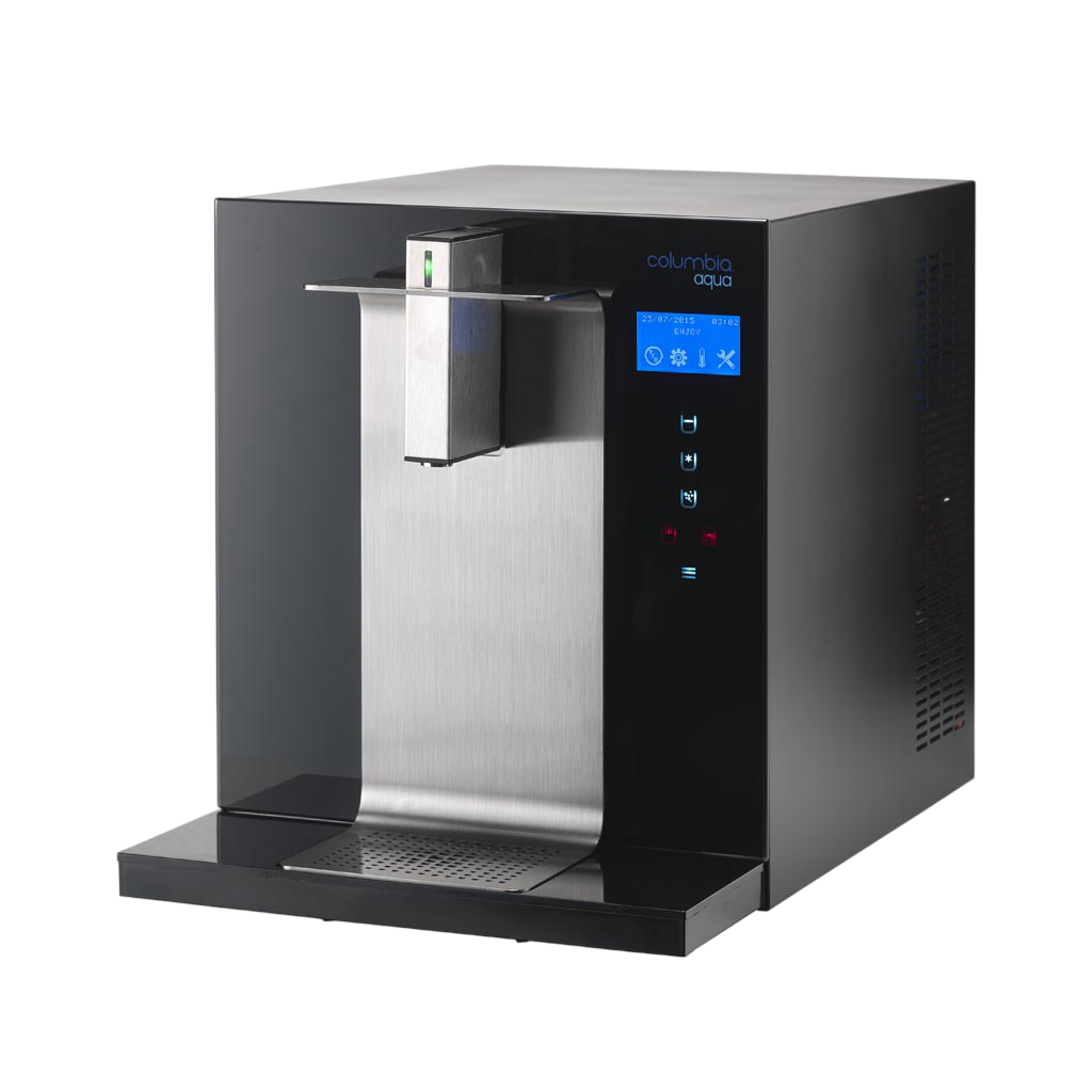 Agua fría, ambiente, caliente, gas. Equipos para oficinas, bares, cafeterías y restaurantes. Dispensador de sobremesa. Acero-ABS con frontal de cristal. Incluye kit de depuradora y depósito; y 48 botellas de cristal.